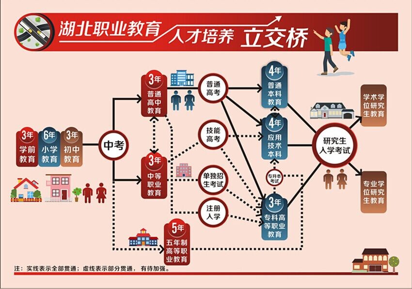 会上,省领导提出要建立完善中职升高职、高职升应用研究型本科和专业学位研究生制度,打通职业教育学生升学通道,拓宽人才成长“立交桥”(如图),让职校生“有盼头”。