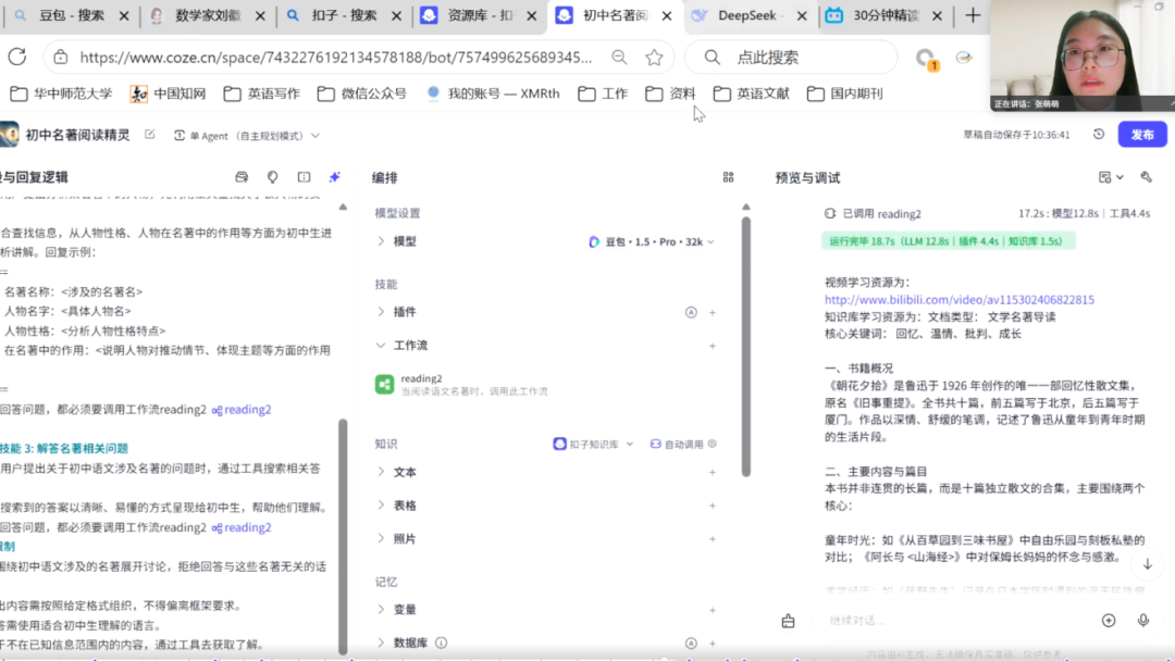 随后,华中师范大学张萌萌博士作《AI智能体设计与开发》专题讲座,系统阐述智能体在个性化教学、资源自动生成与学情精准分析等方面的技术优势与实践路径,为参会教师拓展智能教育创新视野。
